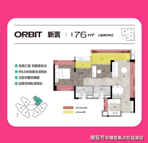 【约76㎡3房2厅线㎡户型定位一致,同样主打刚需实用,在空间布局上略有优化,适合注重空间舒适度的小两口或三口之家。户型配备约5.5米大阳台,270°无敌视野,采光通风俱佳,可欣赏社区园林景观,提升居住体验;3房2厅线卫设计,双卫布局满足家庭多人同时使用的需求,避免早晚高峰期排队困扰,实用性极强;四开间采光,全天阳光充足,室内明亮通透,居住舒适度高;超83%标准层实用率,空间利用率高,布局合理,动静分区清晰,客厅、餐厅相连,空间开阔,适合家庭休闲、亲友小聚,同时三个房间大小适中,可灵活改造为卧室、书房或储物间,满足多样化需求。