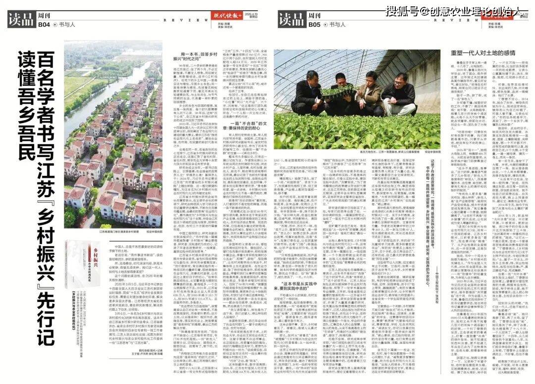 90年前,二十多岁的费孝通走进江苏吴江,住了两个月,不必文献推演,不靠文人想象,用双脚丈量、用数据说话,遂作《江村经济》。他笔下的乡土中国,一面是实证与理性,尽显乡土本色;另一面是诗意与感性——农民看见蚂蚁搬家知道要下雨,看见月亮长毛知道要刮风,与土地共生、与节气同频的生活,代表着一种朴素的田园理想。90年后的今天,《乡村振兴与农业农村现代化》在江苏大地上接住了这份沉甸甸的“乡土答卷”。