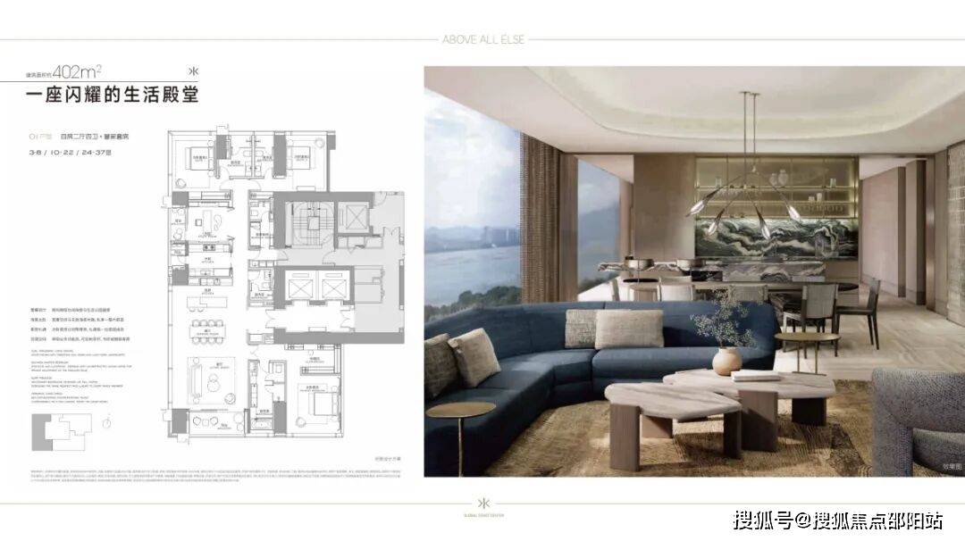 户型规划:由4栋51至63层3.6-3.9米层高的纯居住奢装交付地标、两栋4.5米层高的小高层,35栋独栋,全景幕墙、宽景阳台。