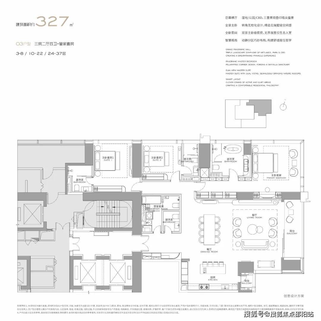 南北通透三面采光,顶奢总统套房规格,270°全景套房,享受湿地/公园/CBD景观,都是套房设计,更具私密性,中西厨分离。
