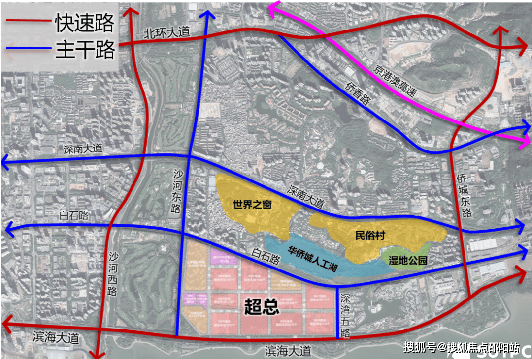 南瞰深圳湾全海景,北观华侨城国家湿地公园,世界之窗,锦绣中华、民族文化村,东面为华侨城蓝楹湾别墅群、125万平欢乐海岸、红树林公园,西北有靠,东南无挡。