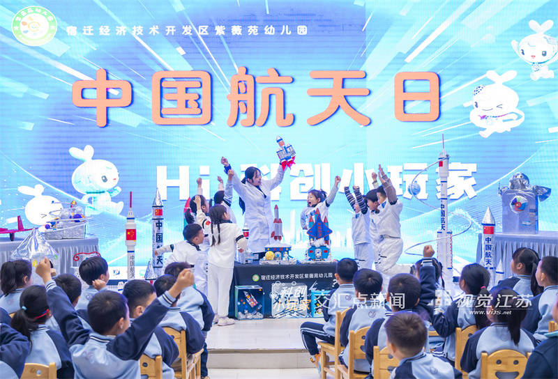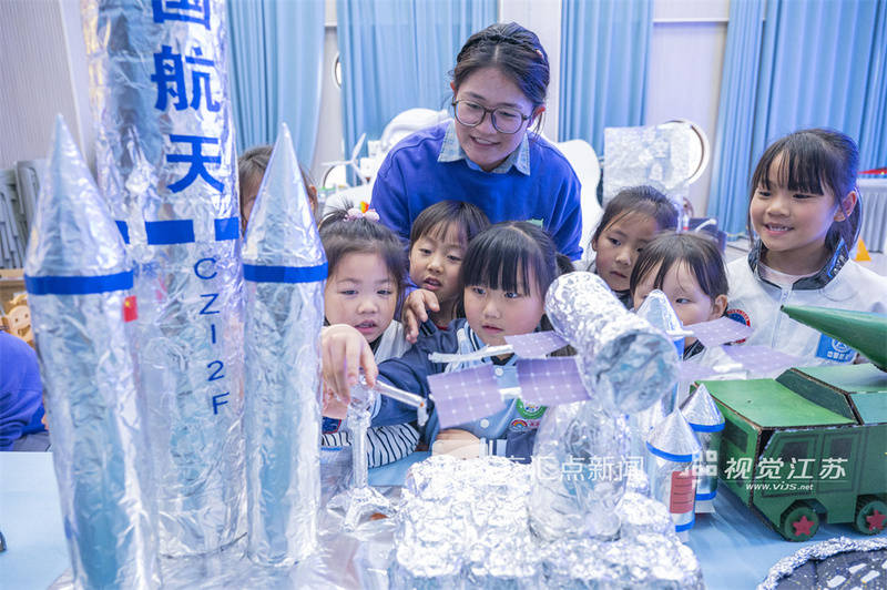 (特约摄影徐江海16:22摄 17:55上线日,宿迁经济技术开发区黄河街道泰和社区紫薇苑幼儿园开展中国航天日主题科普活动,通过讲解中国航天知识、互动科学小实验、亲子自制航天模型展等环节,引导小朋友学习航天知识,感受航天魅力,培养探索航天精神,迎接“中国航天日”。